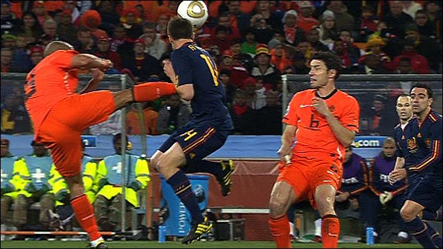 here). At one point in time, a NED player bicycled a kick and cracked a URU player in the mouth. Almost immediately there were cries of "RED CARD", "SEND HIM OFF". In reply there were cries of "WHAT, ARE YOU KIDDING? THIS IS THE WORLD CUP".